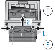 - Slide ink pad into swing F of stamp until the two „wings“ E.